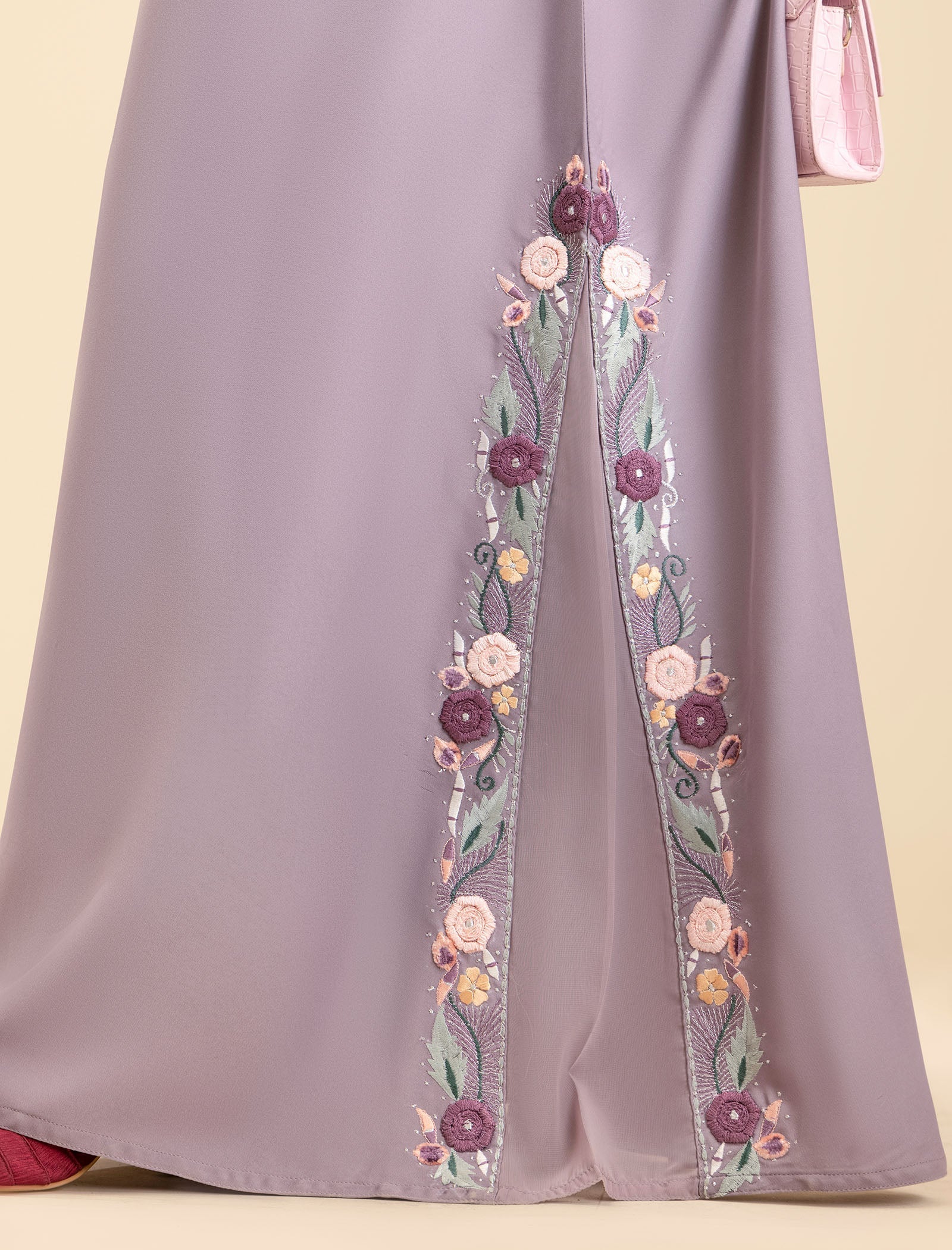 The Amethyst Glow abaya is a perfect blend of modern style and traditional elegance. The embroidery features a mix of threads and colors, designed to match the latest trends. The Kali design on the sleeves and daman (hem) adds intricate beauty and sophistication, enhancing the overall look of the abaya.